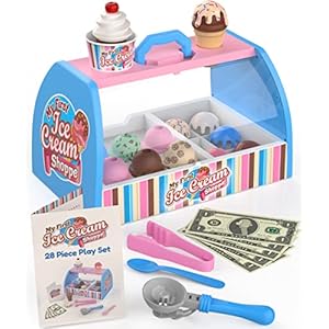 Ice Cream Counter Playset for Kids, Pretend Play (28 pcs) Best Gift for 3 4 5 6 Year Old Girl or Boy, Play Food Scoop and Serve, Toddler Toy