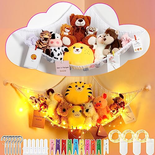 Berlune 2 Set Stuffed Animal Net or Hammock with LED Light, Stuffed Animal Storage Stuffed Animal Hammock Corner Toy Hammock Stuffed Animal Organizer with Clips Hooks for Bedroom Nursery Decor