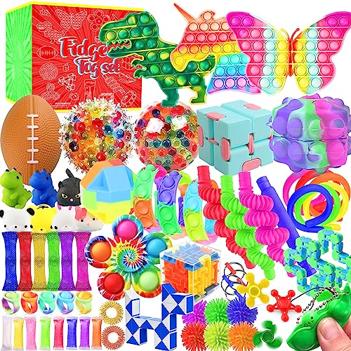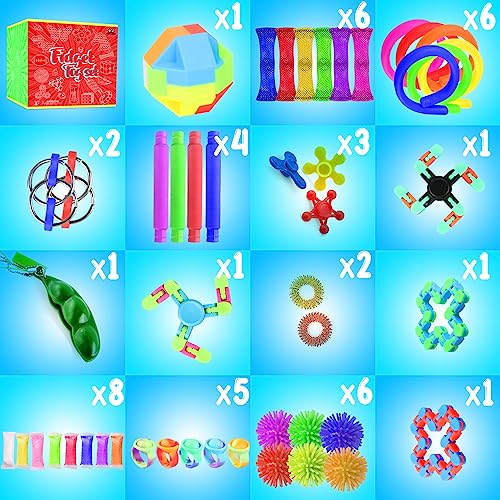 PACK OF 70: 3 Pop Bubble, 2 Mesh Squishy Balls, 2 Flip Chain, 6 Mochi Squishies, 6 Stretchy String Fidgets, 6 Mesh and Marble Sensory Toys, 2 Snake Cube Twist, 1 Tracks Fidget, 1 3×3 Speed Cube, 1 Infinity Cube, 2 Puzzle Boxes, 2 Sensory Rings, 1 Squeeze Soybean, 1 Pop Fidget Spinner, 3 Pop Fidget Bracelets, 5 Pop Fidget Rings, 8 Foam Putty, 1 Chain Robot Spinner, 1 Pop Ball, 6 Spiky Balls, 1 Football Foam Ball, 4 Pop Tubes and 5 Fidget Spinners.