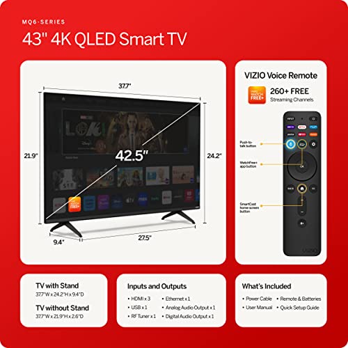 VIZIO 43-inch MQ6 Series 4K QLED HDR Smart TV w/Dolby Vision, WiFi 6E, Bluetooth Headphone Capable, AMD FreeSync & Alexa Compatibility, M43Q6M-K04, 2023 Model