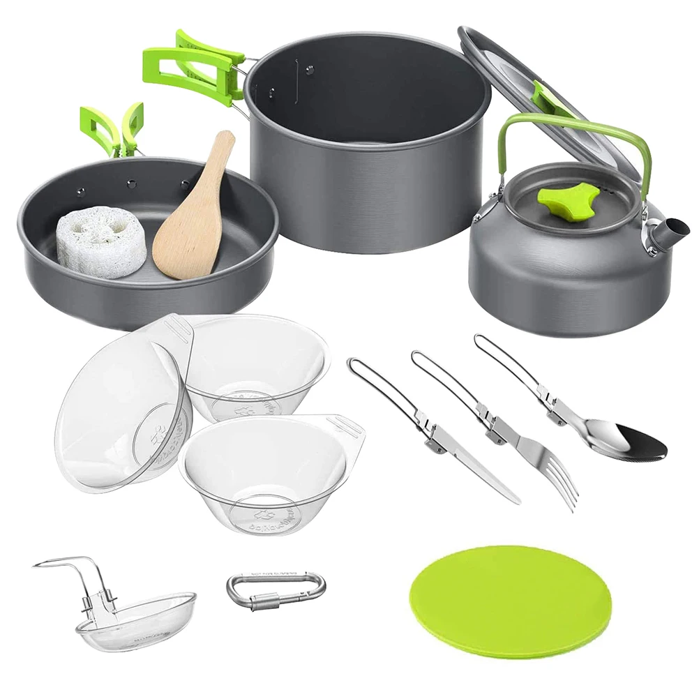 – Including a pot, frying pan, tea pot, spoon, fork, table-cutlery, bowls, soup spoon, buckle, brush and wood spoon, this set can meet your essential needs.
