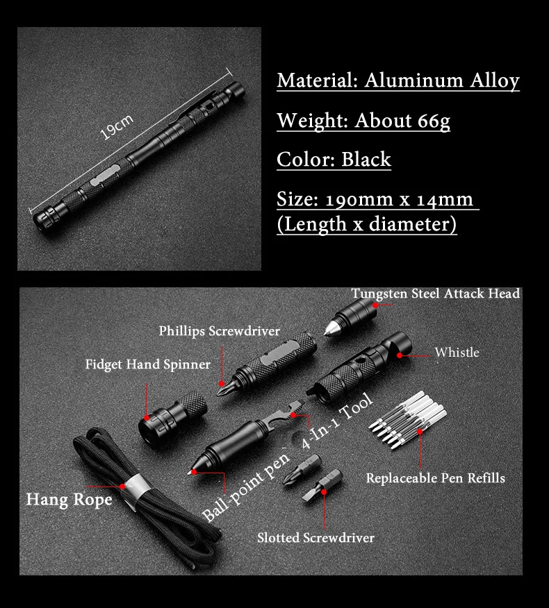 10-In-1 Hand Spinner Self Defense Tactical Pen Whistle Screwdriver Bottle Opener Window Breaker Outdoor Survival EDC Tool Gift